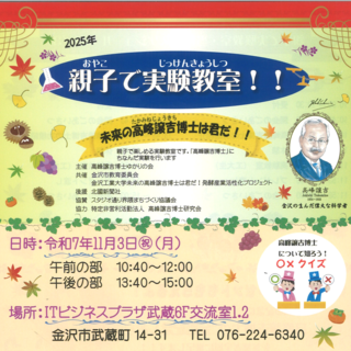 金沢工業大学の学生による課外活動プロジェクト「未来の高峰譲吉博士は君だ! 発酵産業活性化プロジェクト」では、郷土の偉人・高峰譲吉博士にちなんだ親子向けの実験教室「未来の高峰譲吉博士は君だ!!」を、2025年11月3日(月・祝)、ITビジネスプラザ武蔵(石川県金沢市)にて開催します。