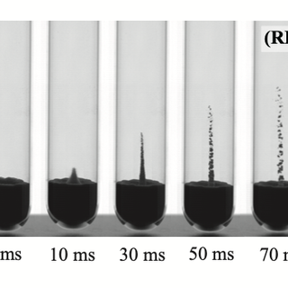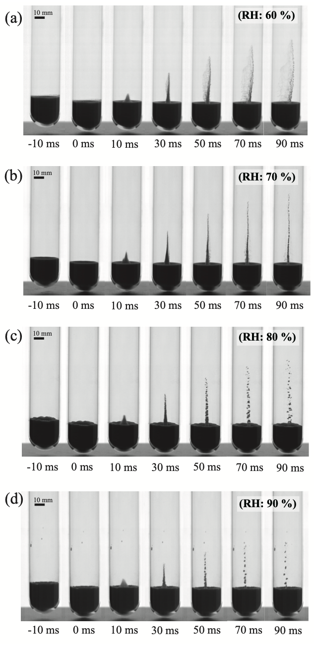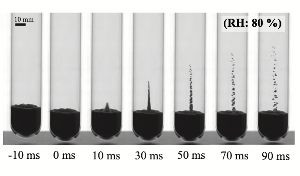 [図2]落下前後における粉体ジェットの形成される様子。湿度が高くなると、ジェットの高さが低くなる様子が見られた。