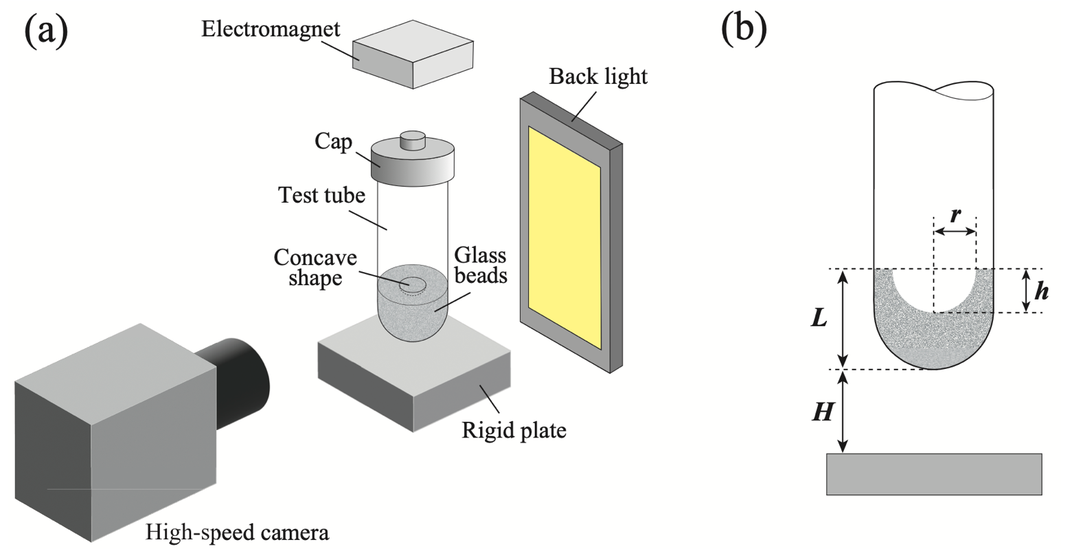 本研究では、ガラスビーズを用いた粉体層に凹面形状の穴を形成し,下から衝撃を与え、その後に生じる粉体ジェットの挙動を高速カメラで撮影、解析することで、湿度による粉体の付着力変化を定量化しました。粉体層を密閉した試験管を自由落下させ、下部の金属板に衝突させて衝撃を与えるシンプルな構成を採用しました(図1)。このとき生じるジェットの高さ・速度を、湿度条件(60〜90%RH)ごとに比較しました。