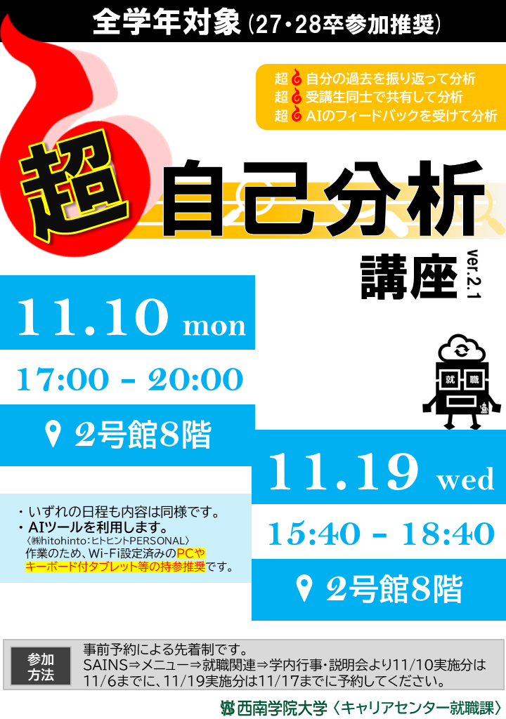 西南学院大学 就職課は、AIツールを活用した自己分析講座を実施いたします。つきまして、取材いただける場合は、前日15:00までに①会社名、②取材人数及び代表者氏名を、下記【本件についてのお問い合わせ先】までご連絡ください。