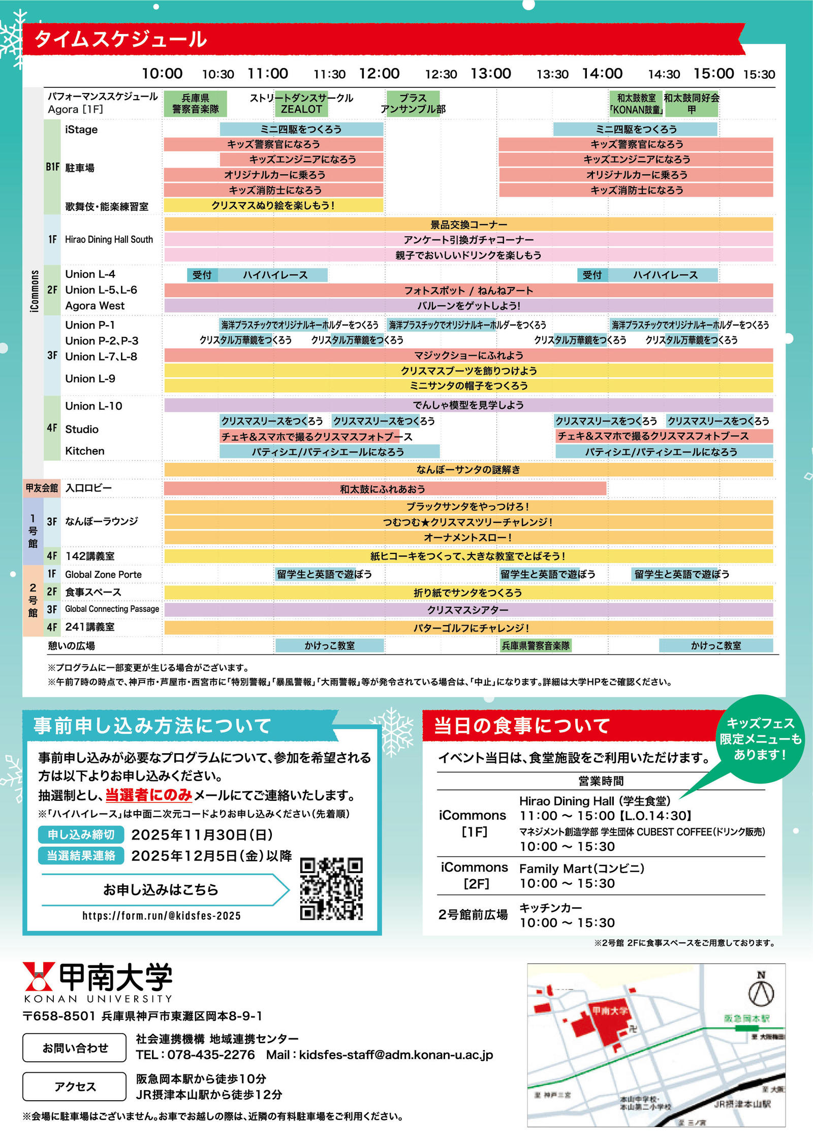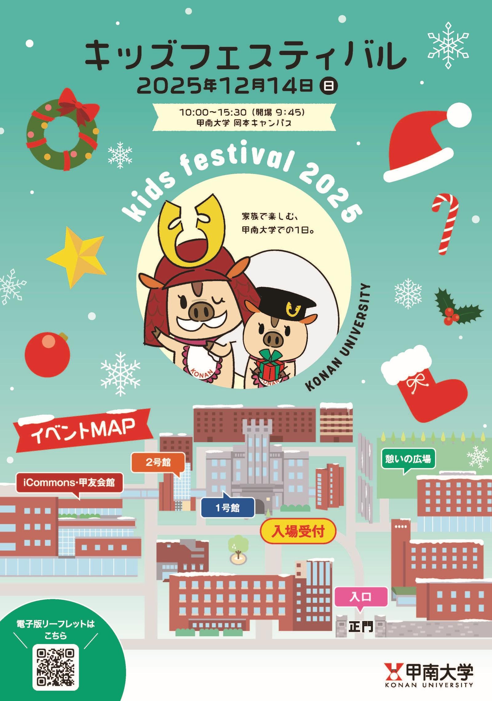 甲南大学は12月14日(日)、小学生以下のお子様を中心とした、ご家族で楽しんでいただけるイベント「キッズフェスティバル」を岡本キャンパス(神戸市東灘区)にて開催します。このイベントは、「家族で楽しむ、甲南大学での1日。」をコンセプトに、地域の皆様に感謝の気持ちを伝えることを目的に、2017年にスタートしました。本イベントは、回を重ねるごとに来場者が増え、前回は2,500名以上に参加いただき、地元企業や団体の協力を得ながら、地域に根差したイベントへと成長しています。