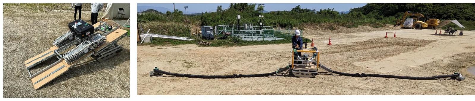 河道閉塞は山間部で起きるため、大型の重機を搬入することは困難です。大須賀教授らは、ヘリコプターで運搬可能な1t程度の小型機材をコンテナに収納して運び入れ、状況に応じて機材を組み替えて異なる作業を行えるようにしました。今回のデモでは4種類のロボットを使い、偵察と排水という2種類のデモを実施します。