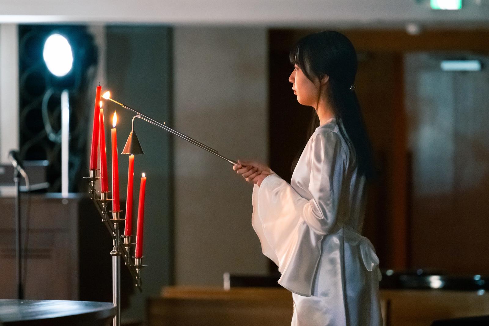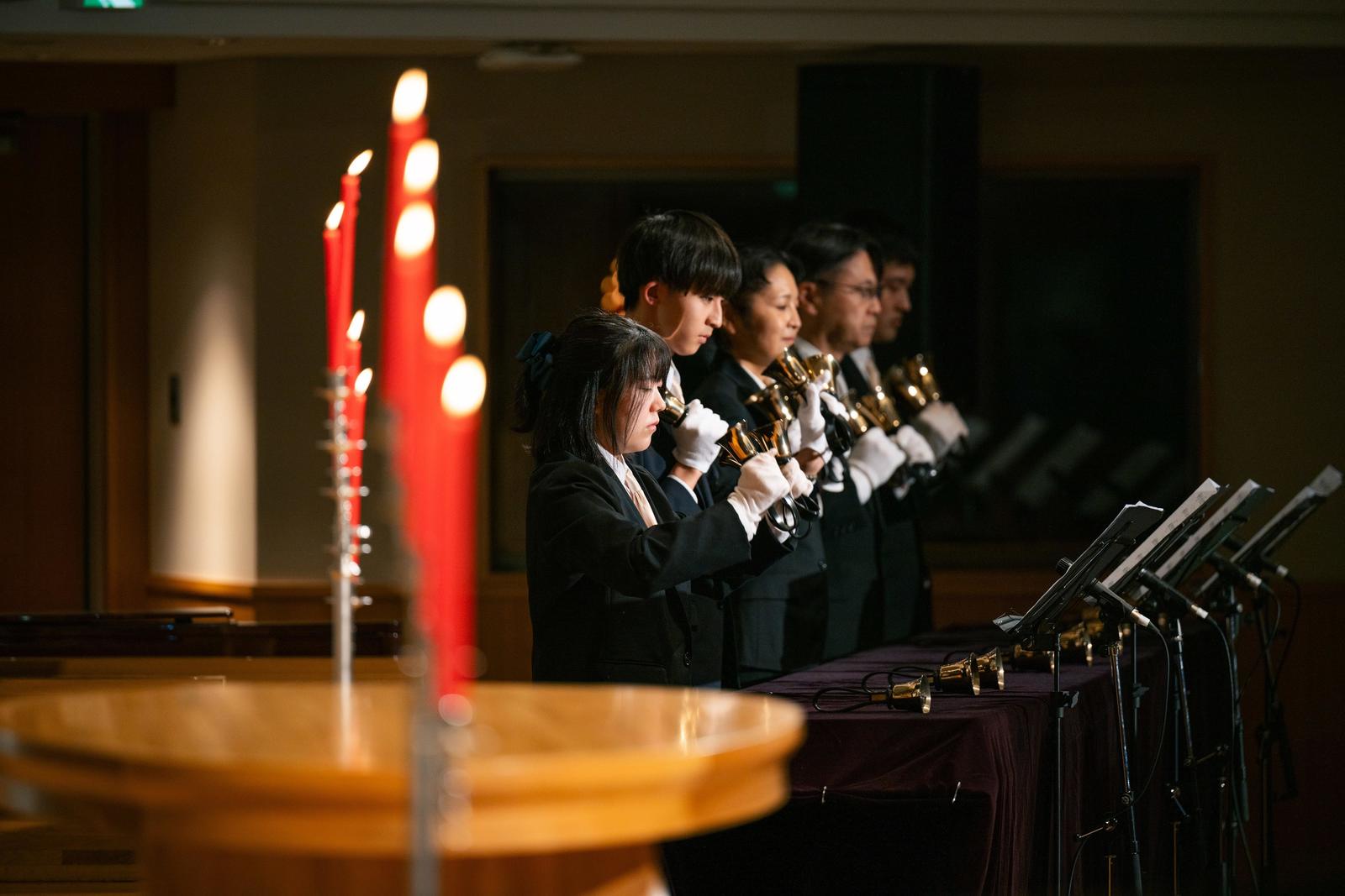 聖学院大学の大切な行事であるクリスマスツリー点火祭は、キリスト教の礼拝形式で行われます。式典はチャペルで開催し、聖歌隊やハンドベルによる賛美の中、天使に扮した学生がろうそくに光を灯し、同時に図書館棟前の大ツリーにイルミネーションが灯ります。