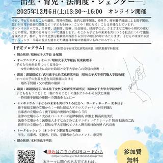昭和⼥⼦⼤学(学⻑ ⾦尾朗:東京都世⽥⾕区)⼥性⽂化研究所は、公開シンポジウム「⼦どもの未来を共につくる社会へ〜出⽣・育児・法制度・ジェンダー〜」を12⽉6⽇にオンラインで開催します(参加費無料・要申込)。