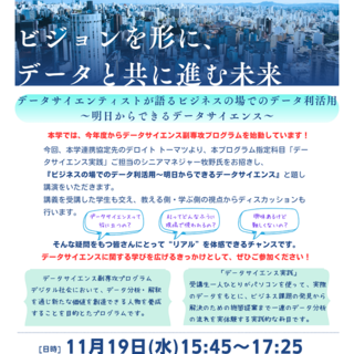 ・前期で開講した「データサイエンス実践」の受講者も登壇し、デロイト トーマツ グループの講師陣から学んだ知見をもとに、教える側・学ぶ側双方の視点からのディスカッションを実施予定