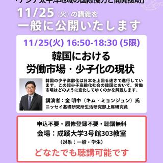 成蹊大学(東京都武蔵野市、学長:森 雄一)は、2025年11月25日(火)に、成蹊大学のオムニバス講義「共生社会トピックス:アジア太平洋地域の国際協力と開発援助」内で行われる講義「韓国における労働市場・少子化の現状」を一般公開します。
