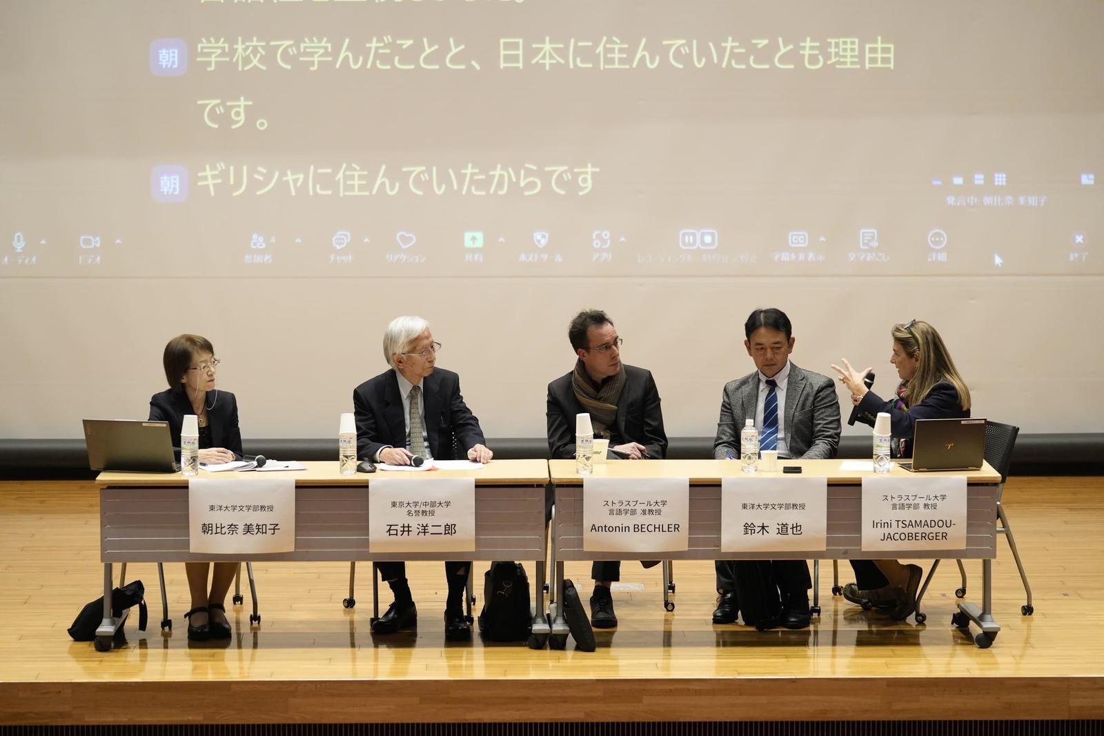 <登壇者>Irini JACOBERGER-TSAMADOS(ストラスブール大学言語学部現代ギリシャ語学科 教授)/朝比奈 美知子(文学部国際文化コミュニケーション学科 教授)/Antonin BERCHLER(ストラスブール大学言語学科日本語学科 准教授)/鈴木 道也(文学部史学科 教授)/[総合コメンテーター]石井 洋二郎(東京大学・中部大学 名誉教授、京都先端科学大学 特任教授)