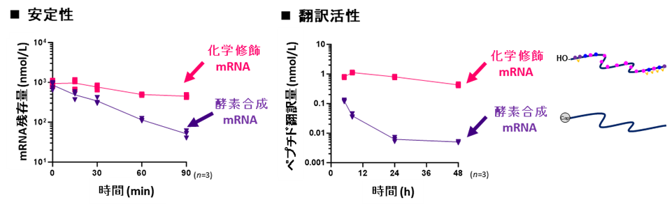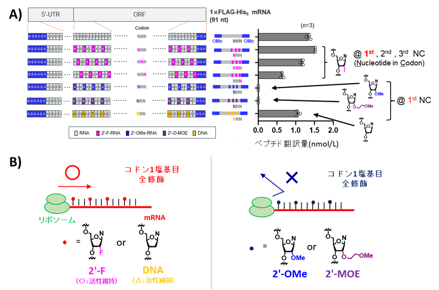 ・コドン注2)1塩基目への選択的化学修飾により、翻訳活性を維持したまま安定性を飛躍的に向上させる設計指針を提示。