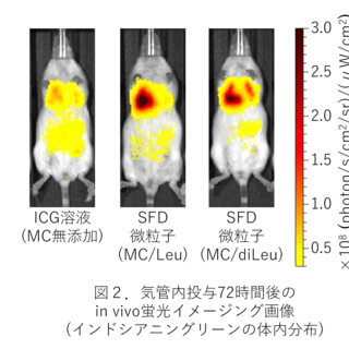 これらのSFD微粒子をマウスに気管内投与した後、モデル薬物として含有したインドシアニングリーン由来の近赤外蛍光をin vivo蛍光イメージング注3)により経時的に検出・解析した結果、MCを含む水溶液と同様にSFD微粒子でも、MCを含まないICG水溶液と比べて肺局所でより長時間にわたり強い蛍光が検出され、MC含有による肺内での薬物滞留性の向上効果が示唆されました (図2)。一方、肺障害性マーカーとして測定した体重・肺重量・動脈血酸素飽和度・気管支肺胞洗浄液注4)中の有核細胞数に変化はみられず、これらのSFD微粒子の高い安全性が窺えました。