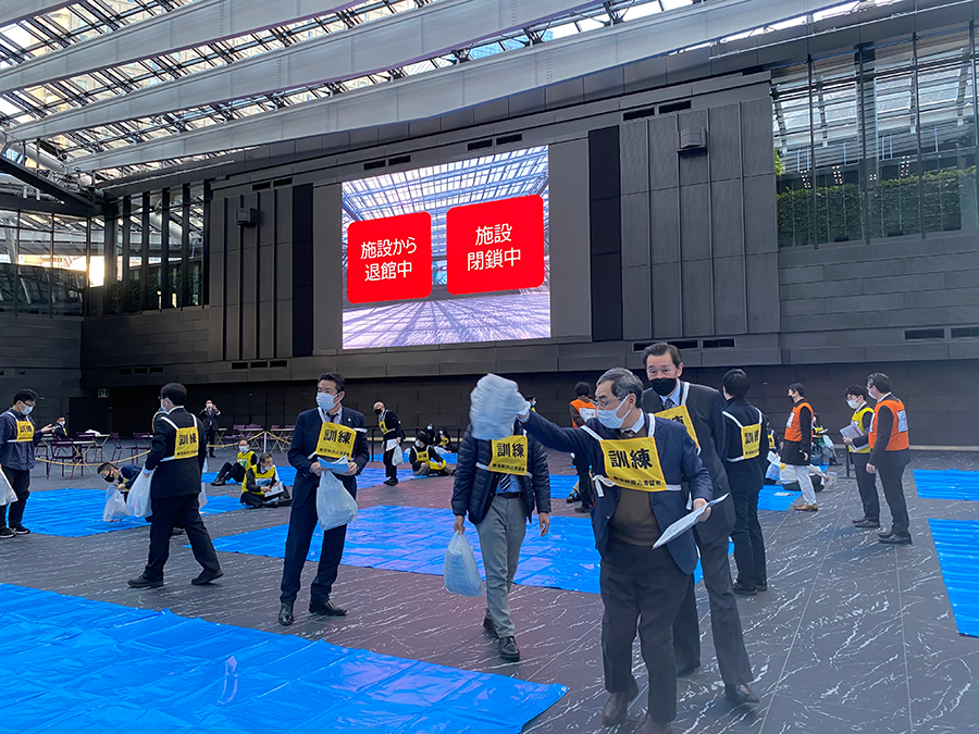 ① 実際の帰宅困難者一時滞在施設を想定し"新宿ならでは"を検証する実動訓練