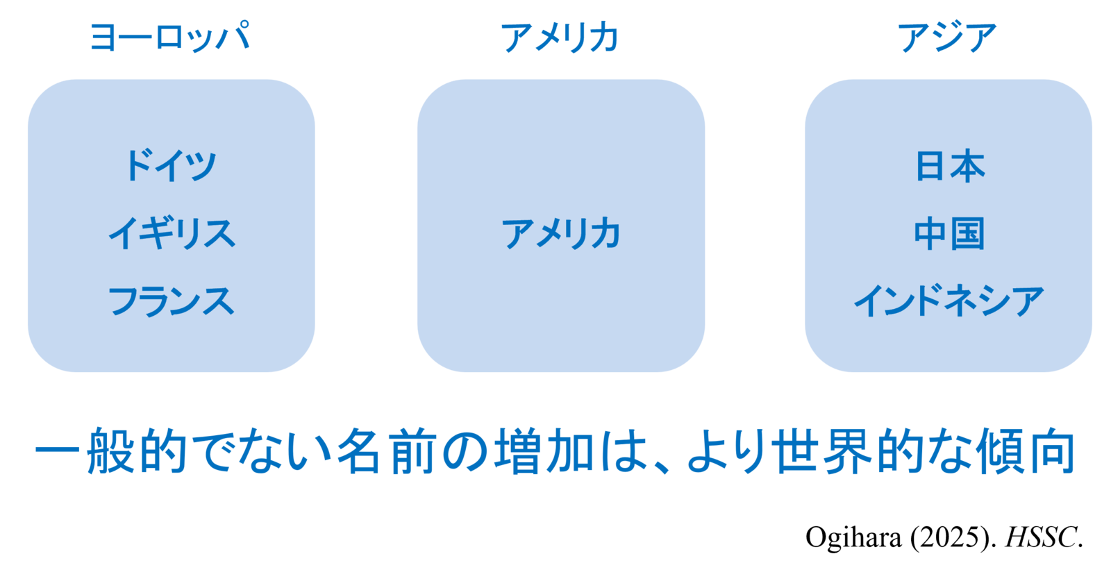 その結果、一般的でない名前は、検討されたすべての国、ドイツ・アメリカ・イギリス・フランス・日本・中国・インドネシアで増加していることが一貫して示された。したがって、この現象は世界的に共通して見られるものであり、一部の限られた国でのみ見られるものではないことが明らかになった。さらにこの傾向は、ヨーロッパ・アメリカ・アジアという多様な文化圏で共通して見られた。よって、一般的でない名前の増加は、より世界的な傾向であると言える。こうした変化は、個性や他者との違いをより強調する方向に、社会・文化が変容していることを示しており、名前や名づけの変化だけでなく、社会・文化の理解にも貢献する。