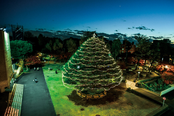 中庭のヒマラヤ杉がライトアップされ、クリスマスツリーに。12月の期間限定でしか見ることができない。