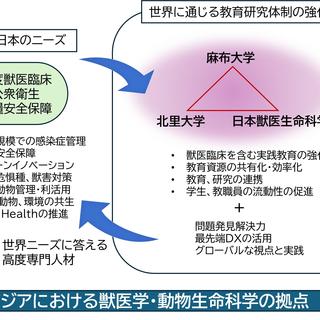 麻布大学、北里大学、日本獣医生命科学大学では、これまでもこれらの教育研究体制の充実化を進めてきました。麻布大学では、従来の獣医学に加えてヒトと動物に関する共生の視点から多くの教育研究業績を生み出し、世界を牽引してきました。北里大学においては、北里研究所を起点とする感染症などの微生物研究において日本の中心的役割を担ってきています。日本獣医生命科学大学では、学是に「人と動物の生命はひとつ」を掲げ、日本で先駆けて獣医学、動物生命科学、食品安全を幅広く教授する体制を整えてきました。