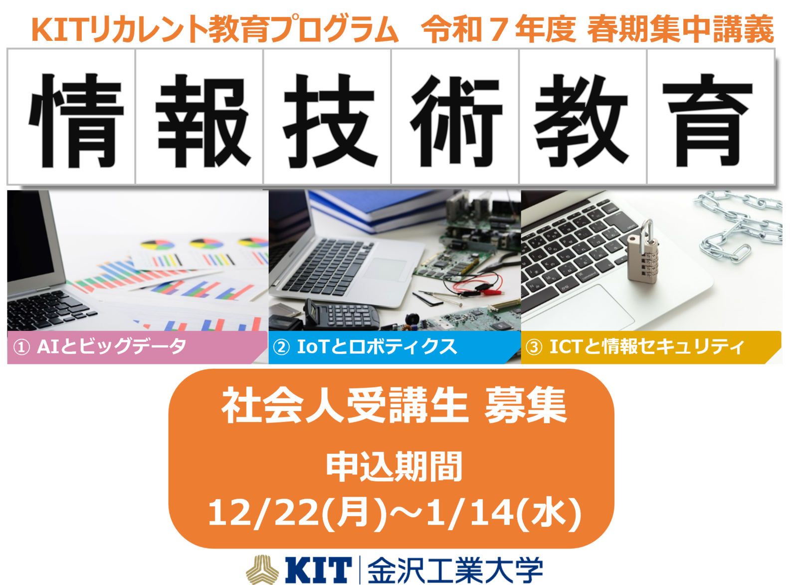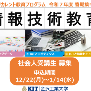 金沢工業大学では、社会人が学生や教員と共に学び合う「KITリカレント教育プログラム」の募集に先立ち、ホームページにて情報を公開しました。募集は12月22日(月)より開始します。2~3月の春期集中講義期間にAIやIoTを中心とする「情報技術教育プログラム」13科目を開講します。
