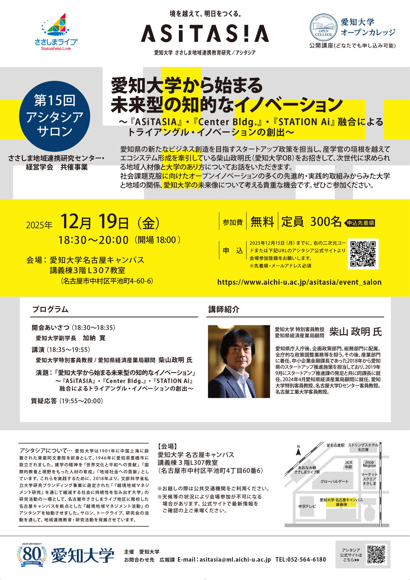 愛知大学ささしま地域連携研究センターは同大経営学会と共催で、12月19日(金)、第15回アシタシアサロン『愛知大学から始まる未来型の知的なイノベーション~『ASiTASIA』・『Center Bldg.』・『STATION Ai』融合によるトライアングル・イノベーションの創出~』を実施。名古屋市鶴舞に開業した日本最大級のオープンイノベーション拠点である「STATION Ai」の立ち上げを主導した愛知県経済産業局顧問の柴山政明氏が講演。会場は同大名古屋キャンパス(名古屋市中村区)で、定員300名 (登録先着)。要申し込み、参加費無料。