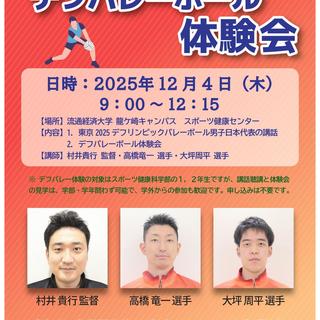 今年11月に東京で初めて開催され注目された、耳が聞こえない・聞こえにくい人たちのためのオリンピック「デフリンピック」。その注目競技のひとつ「デフバレーボール」の体験会を、2025年12月4日(木)に龍ケ崎キャンパスで開催します。講師を務めるのは、東京2025デフリンピックバレーボール男子日本代表の村井貴行監督、高橋竜一選手(主将)、大坪周平選手です!