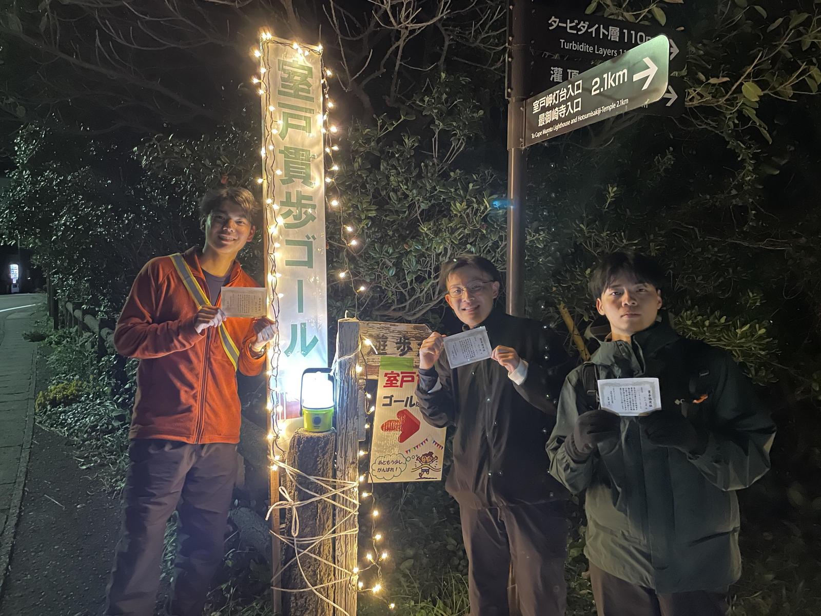 29日19時49分に、トップの参加者が室戸岬に到着。30日午前2時14分には、学生トップとなる高知大学ワンダーフォーゲル部所属の男子学生3人組がゴールした。