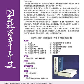 学校法人同志社(総長・理事長 八田英二)は、同志社創立150周年の記念日にあたる2025年11月29日付けで『同志社百五十年史 各学校と関連団体』(『同志社百五十年史』編纂委員会(委員長:小林丈広 同志社社史資料センター所長・同志社大学文学部教授)編、学校法人同志社発行。A5判768頁)を刊行しました。