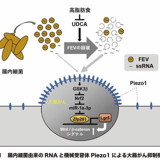 また、高脂肪食によりUDCAが低下し、ssRNAがFEVsから放出されず、Piezo1が活性化できなくなると大腸がんが増悪するという新たなメカニズムも示されました。