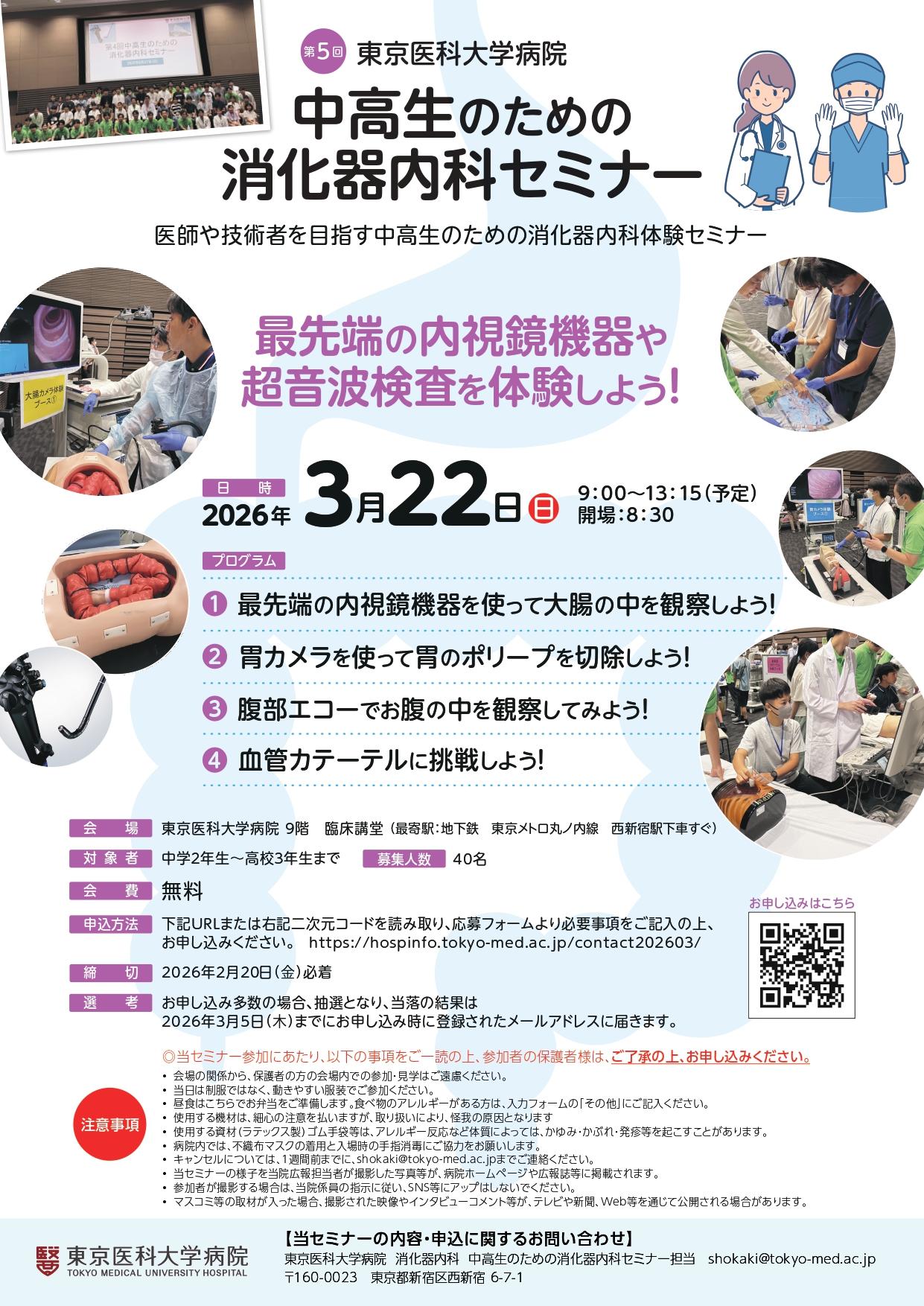 東京医科大学病院消化器内科(新宿区西新宿、主任教授:糸井隆夫)は2026年3月22日(日)、中学2年生~高校3年生を対象に、最先端の内視鏡機器や超音波検査を体験できる「第5回 中高生のための消化器内科セミナー」を開催する。好評だった第1回~第4回に続く実施で、シミュレーション体験を通して中高生が「医療」に興味を持ち、「医療者」や「技術者」を目指すきっかけとなり、医学や医療技術の発展に貢献できればと考えている。参加無料、要事前申込(定員40名・締切:2026年2月20日(金))。