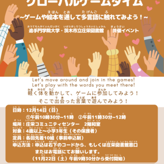 追手門学院大学(略称:追大、大阪府茨木市、学長:真銅正宏)の学生らは12月14日(日)、茨木市立庄栄図書館内にある庄栄コミュニティセンター(大阪府茨木市)でワークショップイベント「追大生と一緒に♪ グローバルゲームタイム ~ゲームや絵本を通して多言語に触れてみよう~」を開催する。これは、地域の子どもたちにゲームや絵本を通して多言語に親しんでもらうことを目的として、同館と協働で実施するもの。図書館が地域の学びや交流を担う場として注目される中、子どもたちが多文化に親しむきっかけとなることが期待される。参加費無料、要事前申し込み(定員:各回先着10組)。