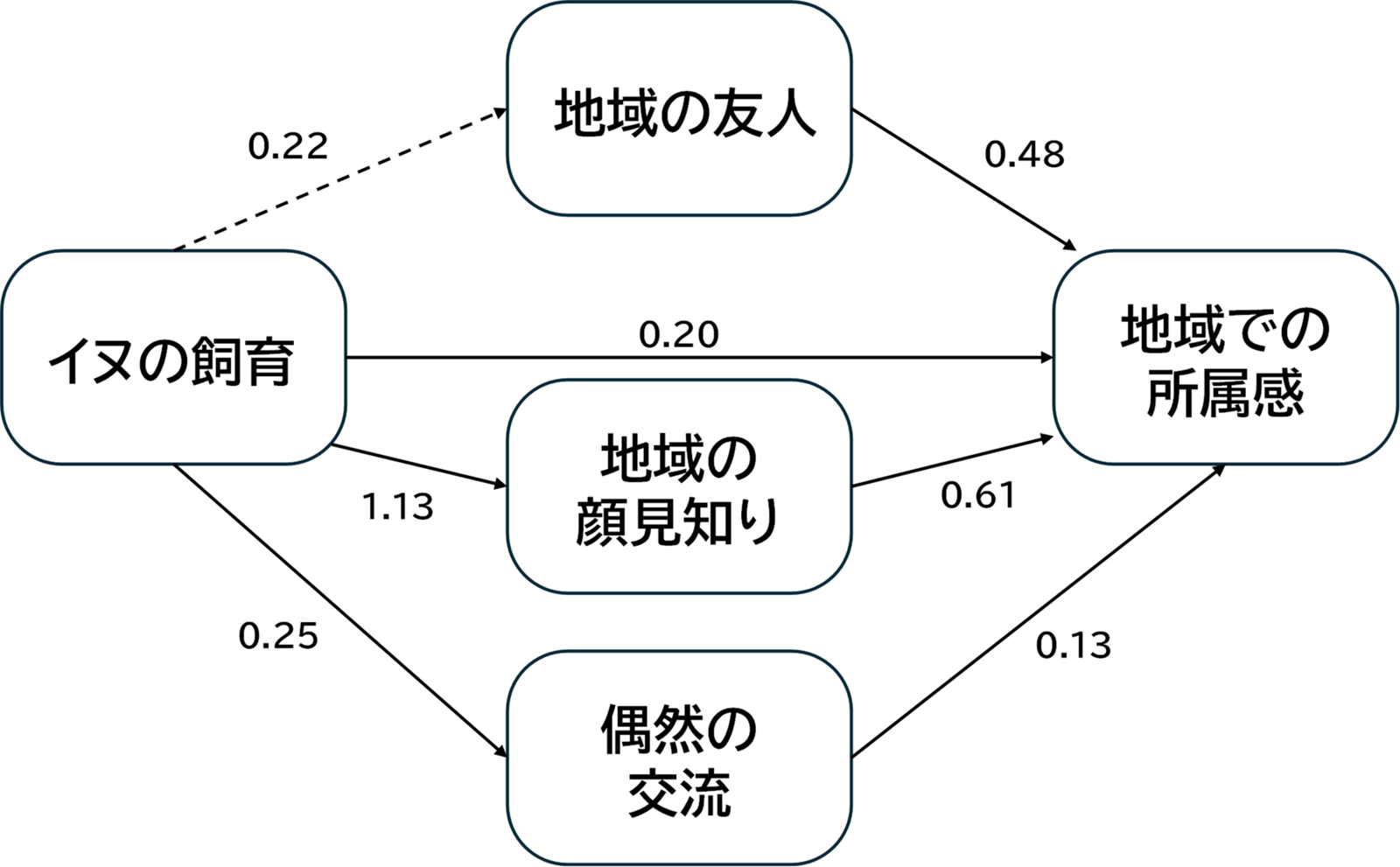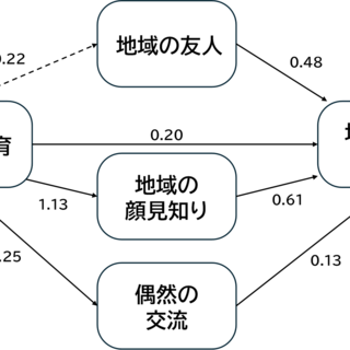 (※添付ファイル:「図 イヌの飼育が地域の顔見知りと関連し、また地域における偶然の交流を高め、その結果、地域での所属感につながる関連性が見いだせた」参照)