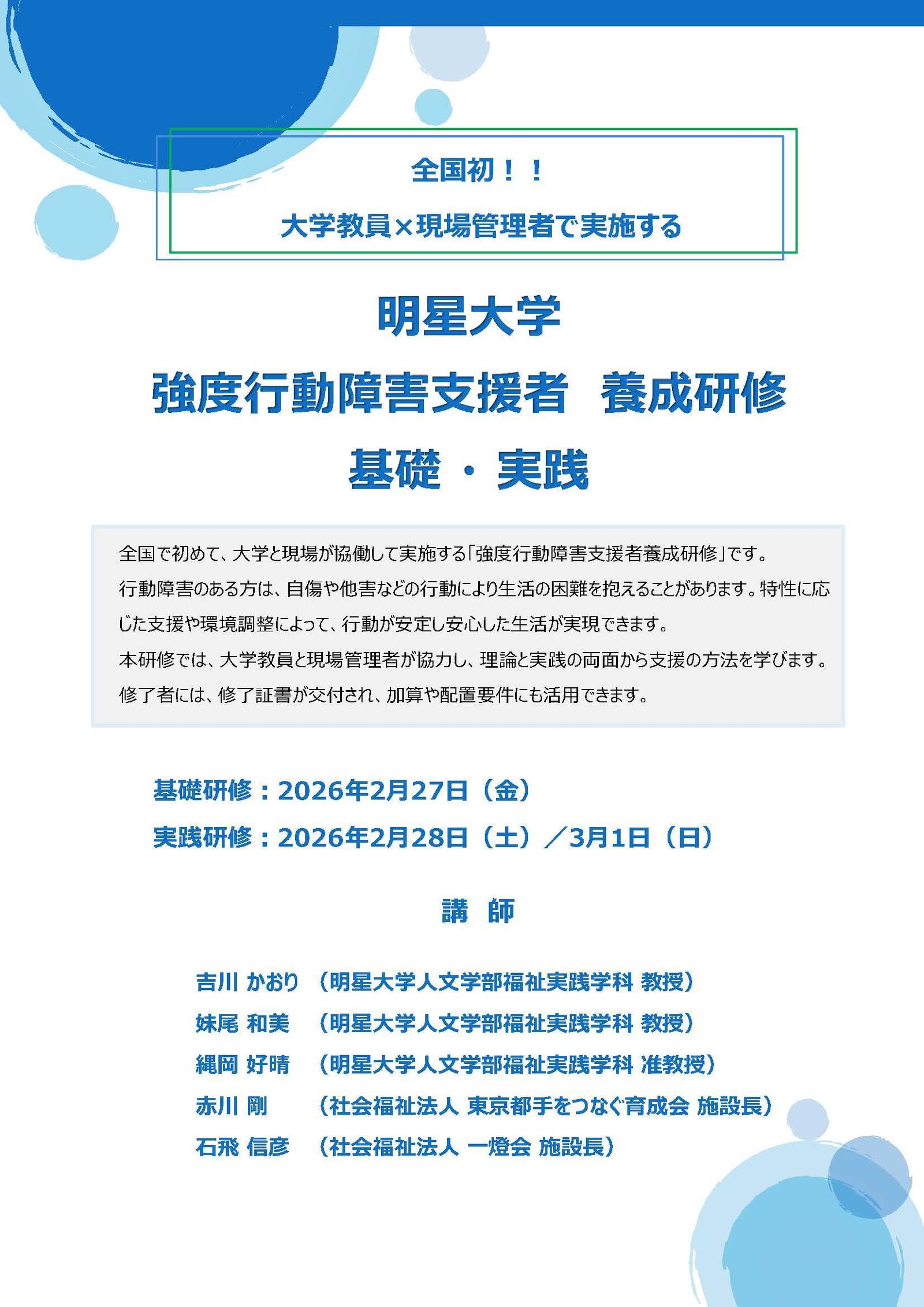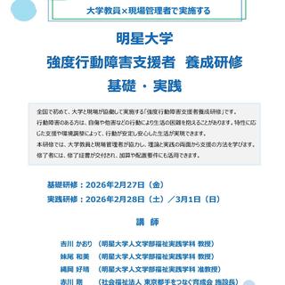 明星(めいせい)大学(東京都日野市、学長:冨樫 伸)人文学部福祉実践学科は、2026年2月より「強度行動障害支援者養成研修(基礎・実践)」を開講します。強度行動障害への支援体制強化が求められる中、東京都から認可を受けた研修指定事業者として、大学が本研修を実施するのは全国で初めての取り組みとなります。大学教員と現場管理者が連携し、理論と実践を融合した支援者育成をめざします。