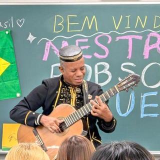授業では、ギターを奏でながら、ブラジルの文化はポルトガル人・先住民・黒人・外国人移民の文化が融合して形成されていることや、ミゲル氏は先住民の先祖を持ち、近年は自然と一体の暮らしを継承してきた先住民の豊かな文化や多数の言語が失われつつあることの懸念をお話しされました。また、2025年は、ブラジルと日本の正式な国交が結ばれてから130周年という友好交流年であり、両国の架け橋となるブラジルの日系社会や在日ブラジル人を通じた両国の深い結びつきについても言及されました。