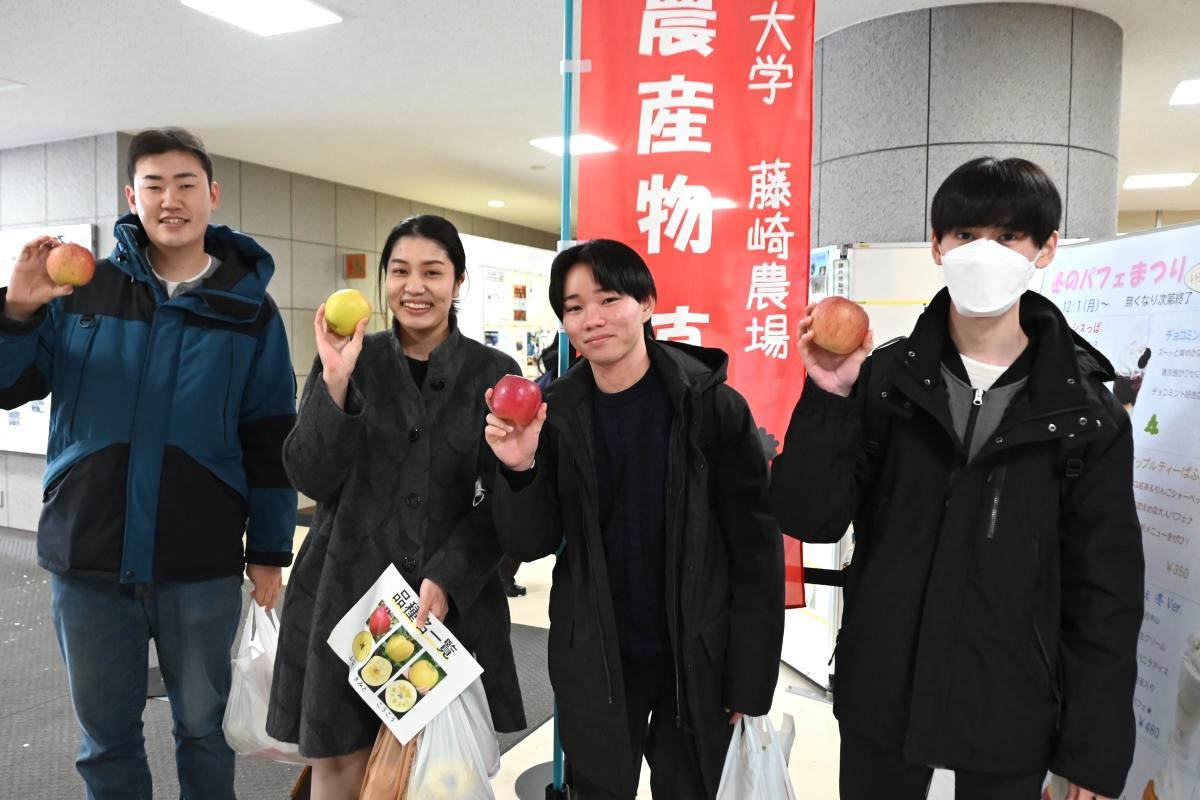 今回の販売は、学生をはじめ、教職員、地域住民などに藤崎農場で栽培されたりんごについて知ってもらうことを目的として、文京町キャンパス内で実施しました。当日は、木箱から自分でりんごを選び、笑顔で購入する学生の姿が多く見かけられました。また会場では、りんごのほかに同農場産のニンジンの販売も行い、大いに賑わいました。
