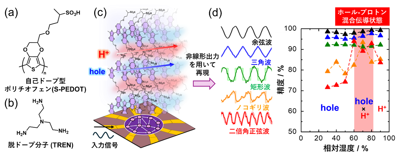 (a)自己ドープ型ポリチオフェン(S-PEDOT)と(b)脱ドープ分子である多価アミンの化学構造、(c)本系におけるホール-プロトン混合伝導状態を示すイメージ図。(d)混合伝導状態を示す条件にてマテリアルリザバー素子の性能(波形生成タスクの精度)が向上することを示す図。