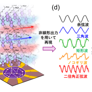 本研究で見いだされた本質的な混合伝導状態を示すニューロモルフィック分子ネットワーク※4は、近年、神経模倣型のデバイスとして注目されるマテリアルリザバー素子※5に必要な、非線形応答・短期記憶・高次元性といった特性を兼ね備えており、このような混合伝導状態を活用することで、マテリアルリザバーの素子性能を評価するベンチマークタスクの一つである波形生成タスク※6の精度が向上することを初めて実証しました(図1d)。ホールとプロトンが協奏的に働く本伝導メカニズムは、生体に近い省エネルギー動作を可能にする新たなAIデバイス設計指針として期待されます。