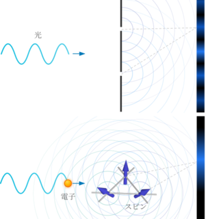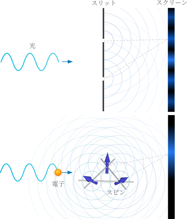 2重スリットによる光の干渉縞(上)と磁気散乱による電子波の位相干渉効果(下)。 2重スリットの実験では、それぞれのスリットを通った光の干渉により縞模様が生じる。磁気散乱では、それぞれのスピンで散乱された電子波の干渉により電子の軌道が曲がり、上方向に飛んでいく。