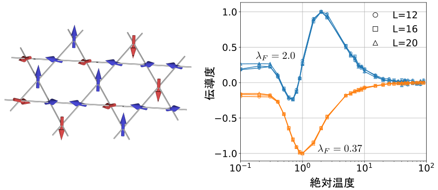 カゴメアイス模型の概念図(左)とホール伝導度の温度依存性の数値シミュレーション。λ_F は電子波の波長(フェルミ波長)。
