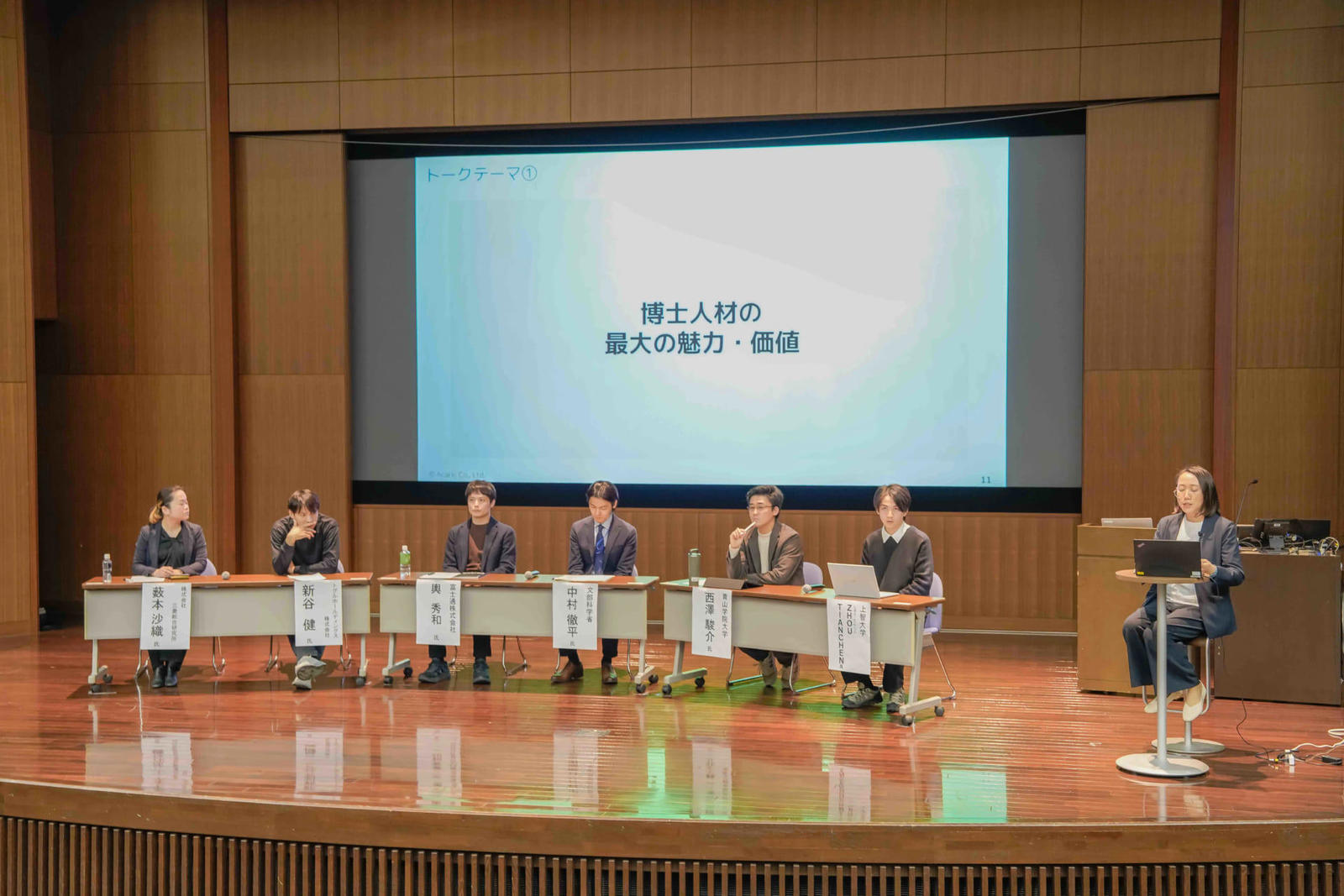 当日は、会場・オンライン合わせて、約120名の大学関係者、民間企業関係者、学生、省庁関係者が参加した。文部科学省や、富士通株式会社、トグルホールディングス株式会社、株式会社三菱総合研究所など、博士人材の活躍推進をリードする企業による講演のほか、両大学の選抜学生による研究プレゼンテーションが行われ、高度な専門知を持つ博士人材の社会での活躍可能性について議論を深めた。