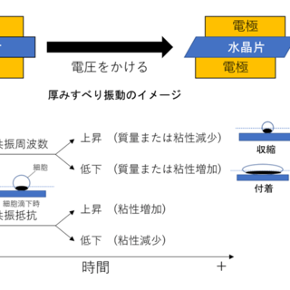 QCMは電極表面に付着した細胞の質量や粘弾性の変化を、共振周波数の変化として高感度に検出できる技術である(図1)。本研究ではQCMと蛍光顕微鏡を組み合わせることで、抗がん剤処理中の細胞の物理的変化と細胞死を同時に観察し、薬剤ごとの細胞応答の違いを明らかにすることを目的とした。