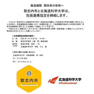 2026年1月15日(木)、北海道歌志内市と北海道科学大学は、包括連携協定の締結式を実施します。