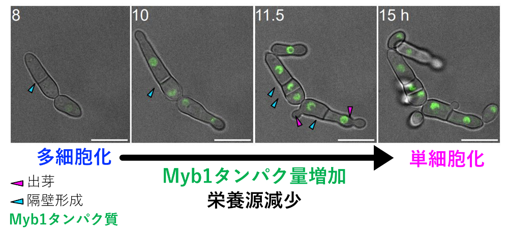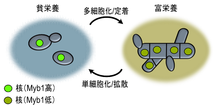 ・単細胞増殖している酵母に栄養を与えると、細胞内のMyb1タンパク質が急速に分解され、多細胞体の成長モードへと転換した。逆に、Myb1の発現は単細胞化を誘導した。Myb1が単細胞性―多細胞性変換の分子スイッチであることが示唆された。